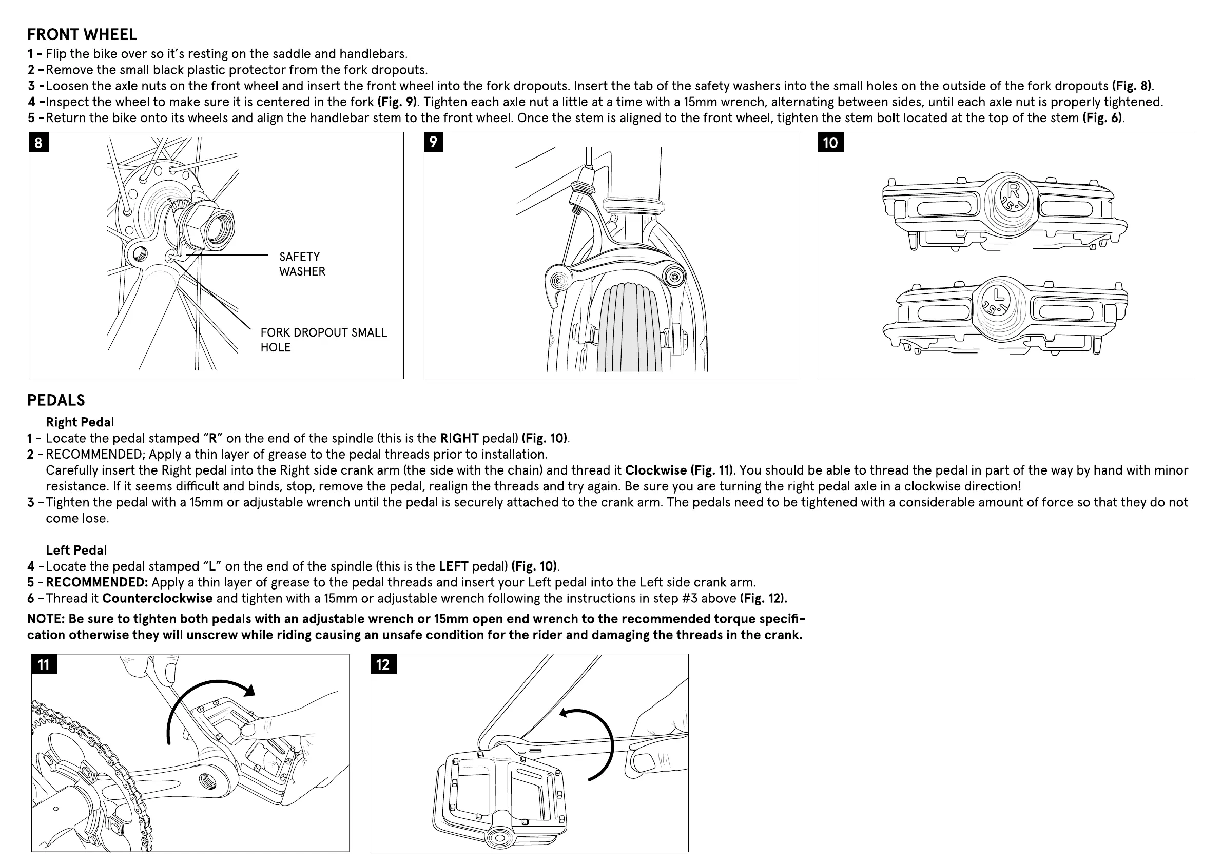 4 -Inspect the wheel to make sure it is centered in the fork (Fig. 9). Tighten each axle nut a little at a time with a 15mm wrench, alternating between sides, until each axle nut is properly tightened.