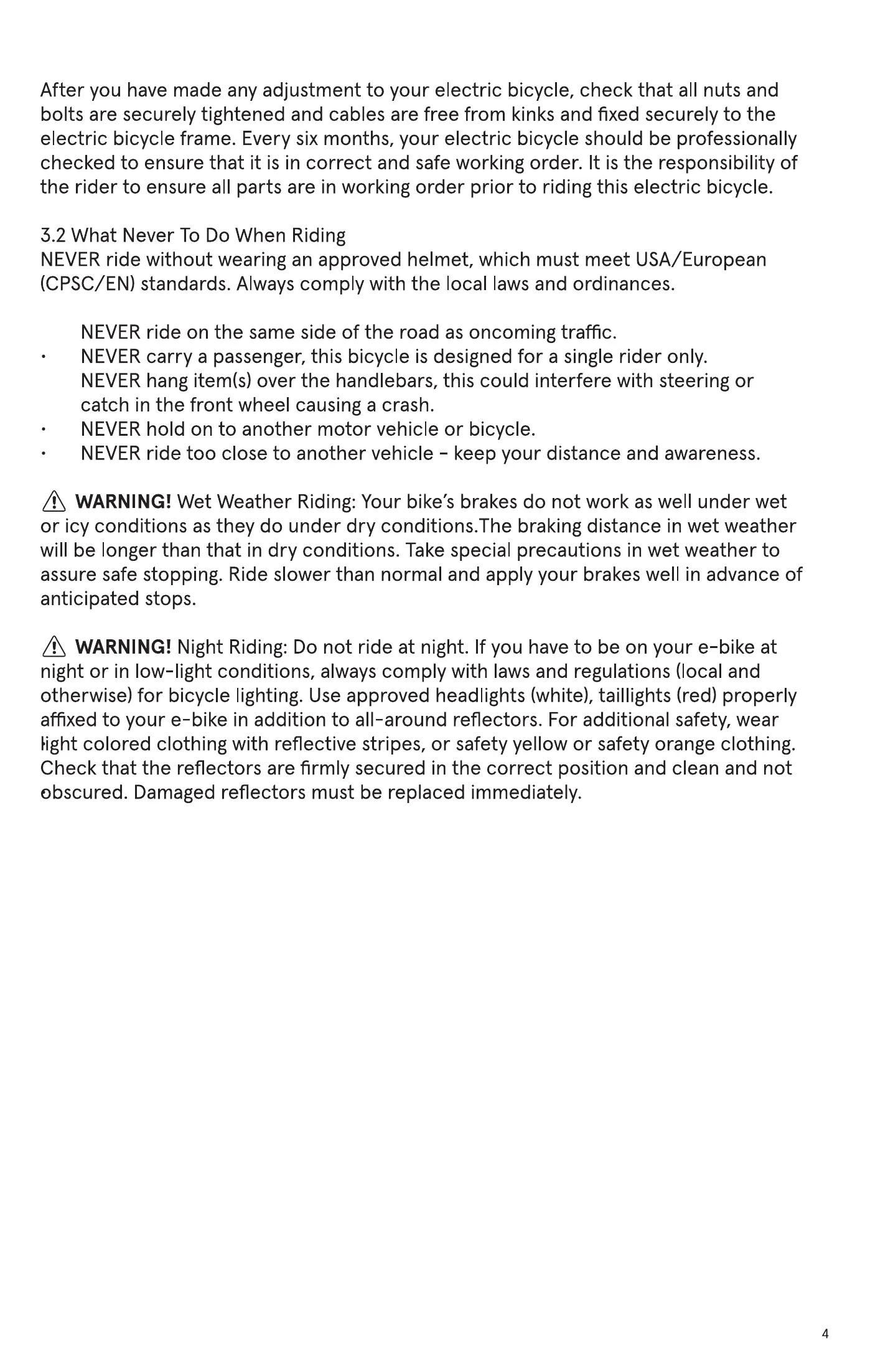 WARNING! Night Riding: Do not ride at night. If you have to be on your e-bike at