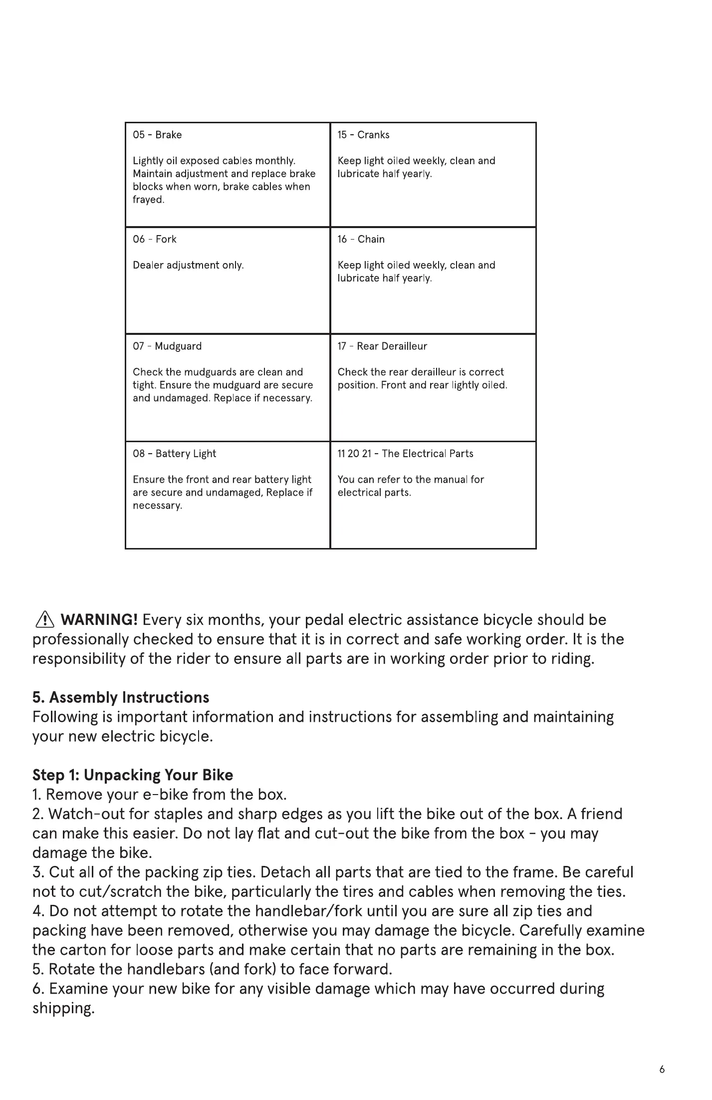 WARNING! Every six months, your pedal electric assistance bicycle should be