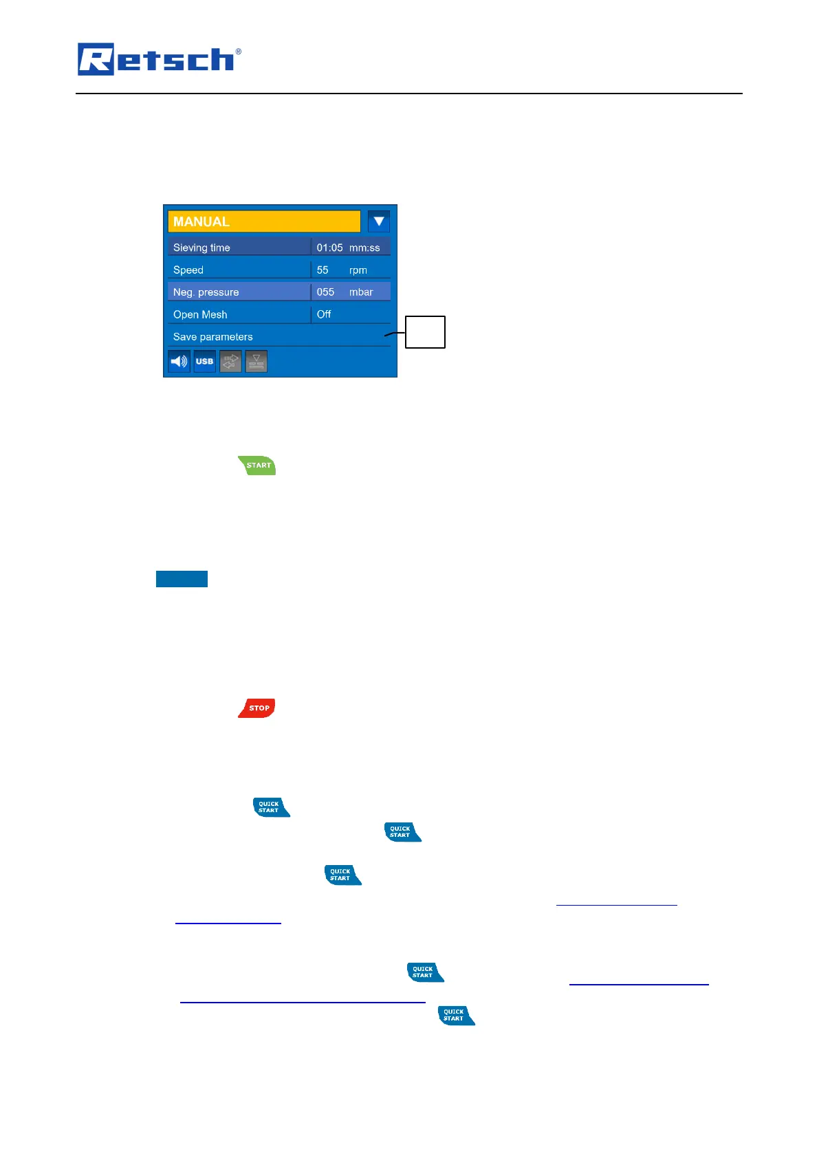 In the "Quick start" operating mode, a frequently used parameter set can be defined and
