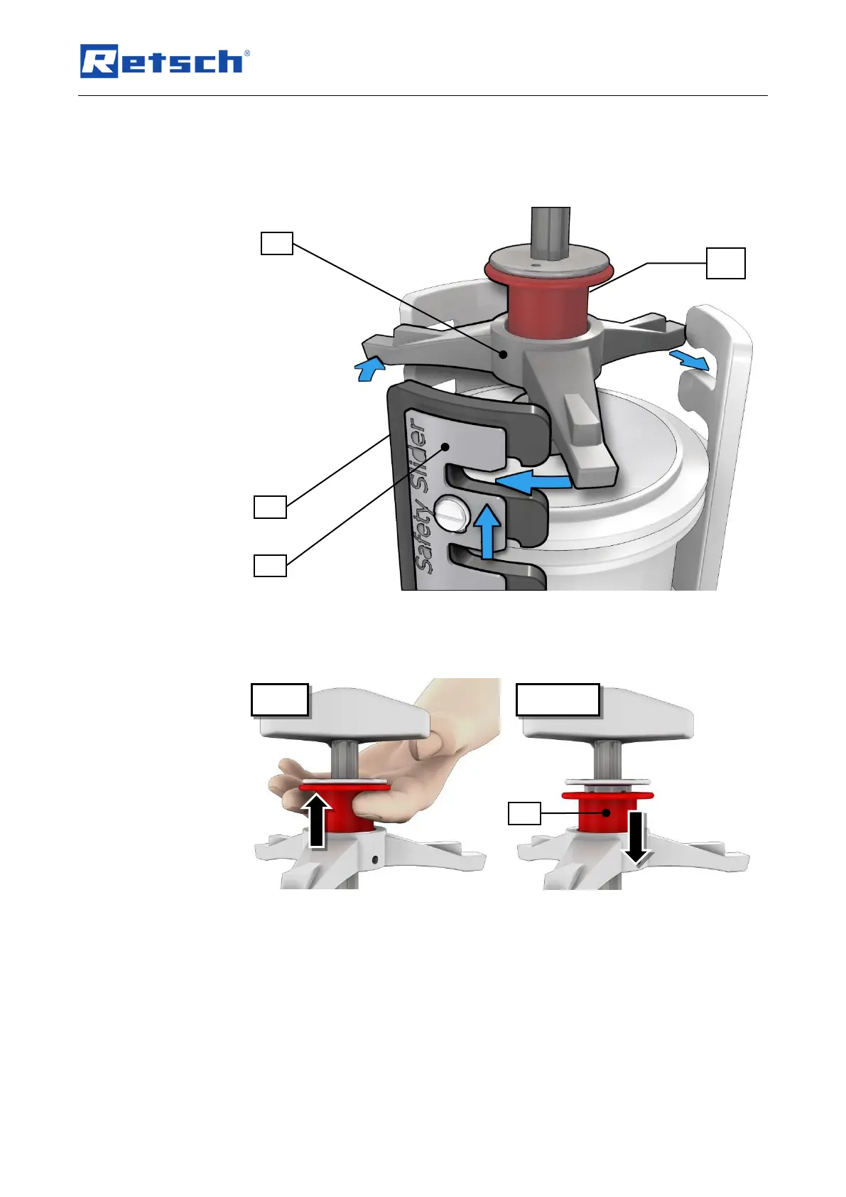 • Pull the red sleeve (CA) upwards and clamp the grinding jar by twisting the