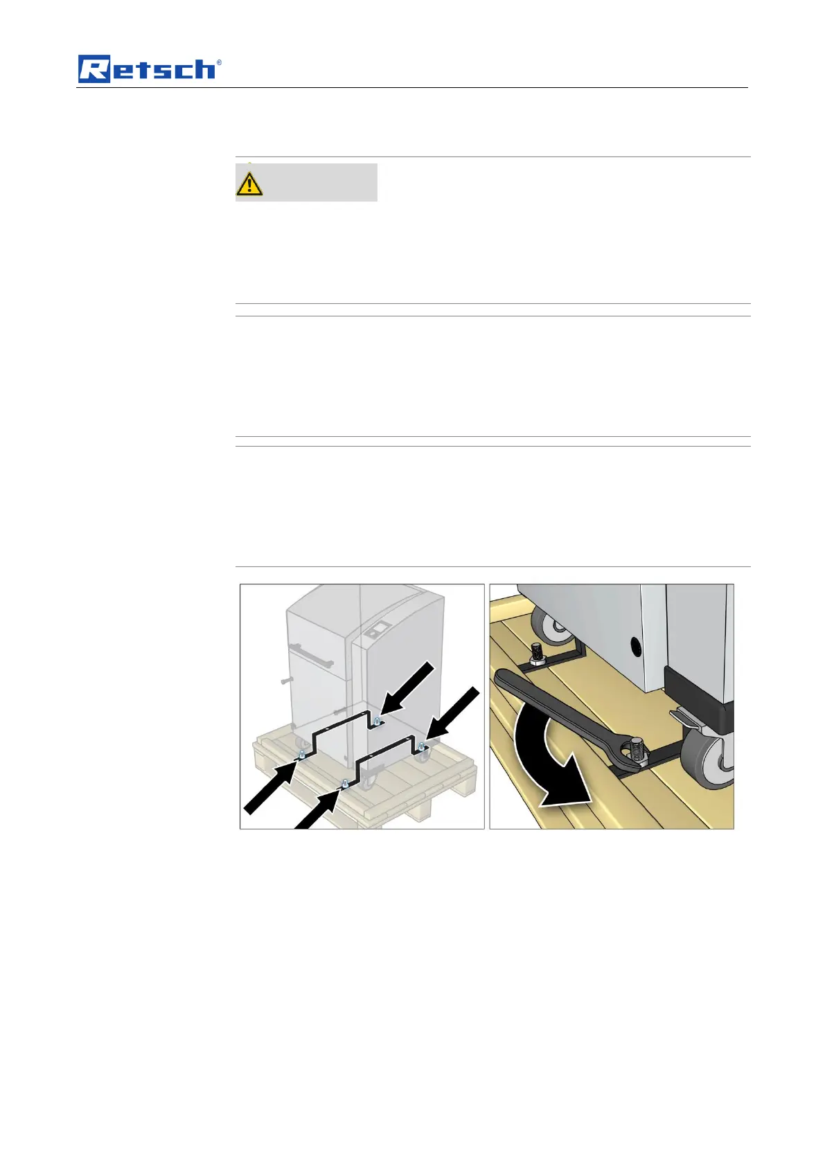 The device is secured to the transport pallet by the transport lock and four nuts.