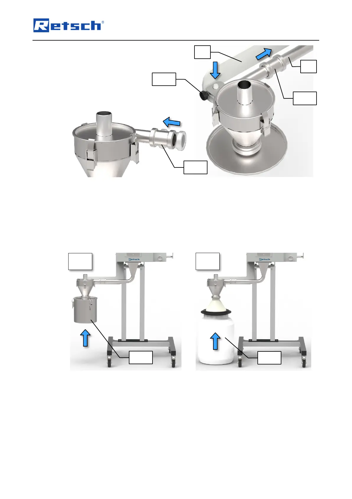 Fig. 43: Placing the coupling (left) and mounting the cyclone funnel (right)
