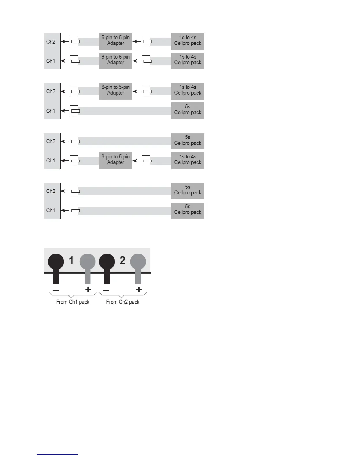 2. When charging two packs simultaneously, connect the discharge wires into the banana jacks as shown