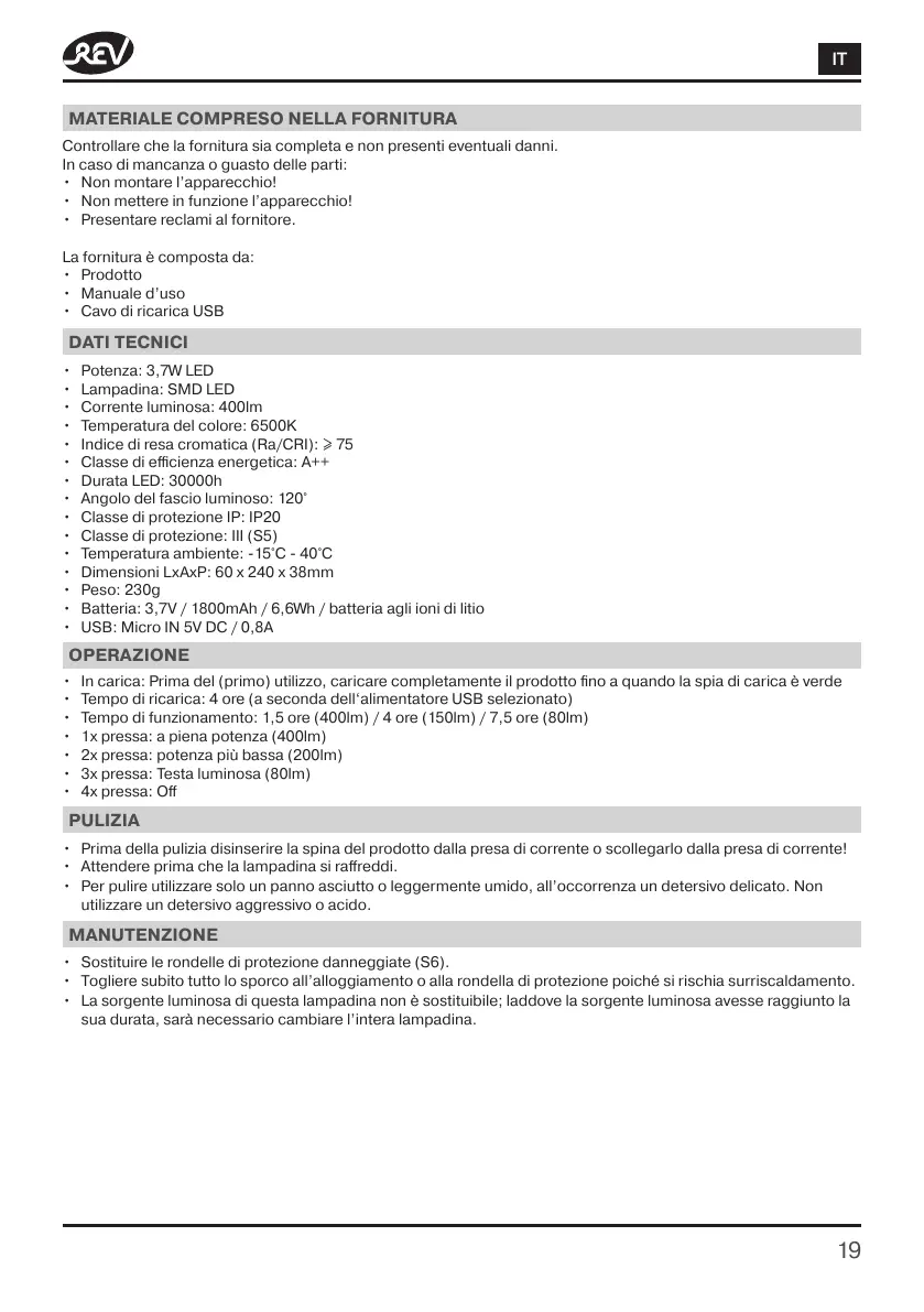 • Tempo di ricarica: 4 ore (a seconda dell‘alimentatore USB selezionato)