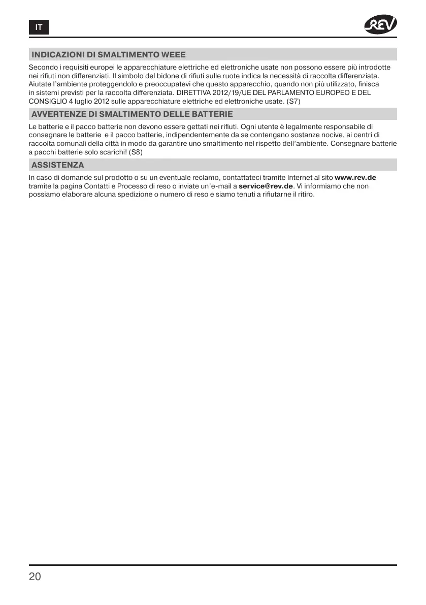 In caso di domande sul prodotto o su un eventuale reclamo, contattateci tramite Internet al sito www.rev.de