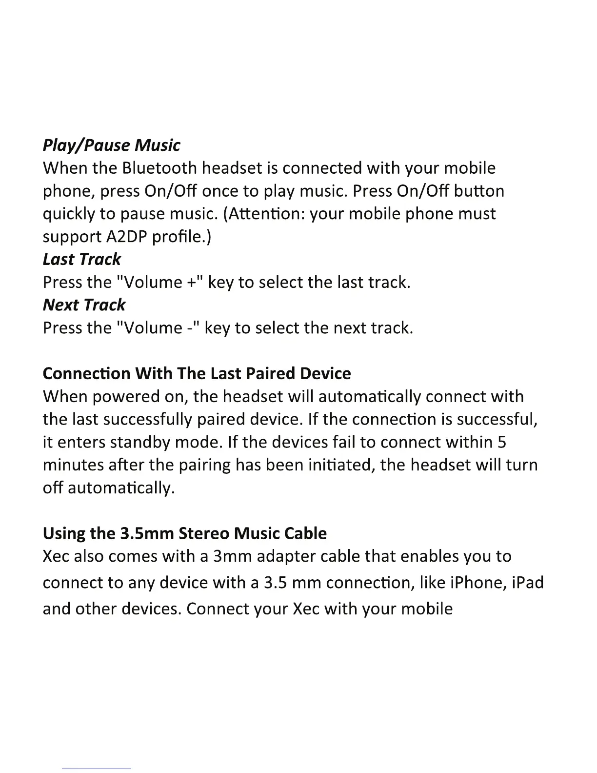 RevJams Xec - Music Playback Controls; Connecting to Last Paired Device; Using the 3.5 mm Stereo Music Cable