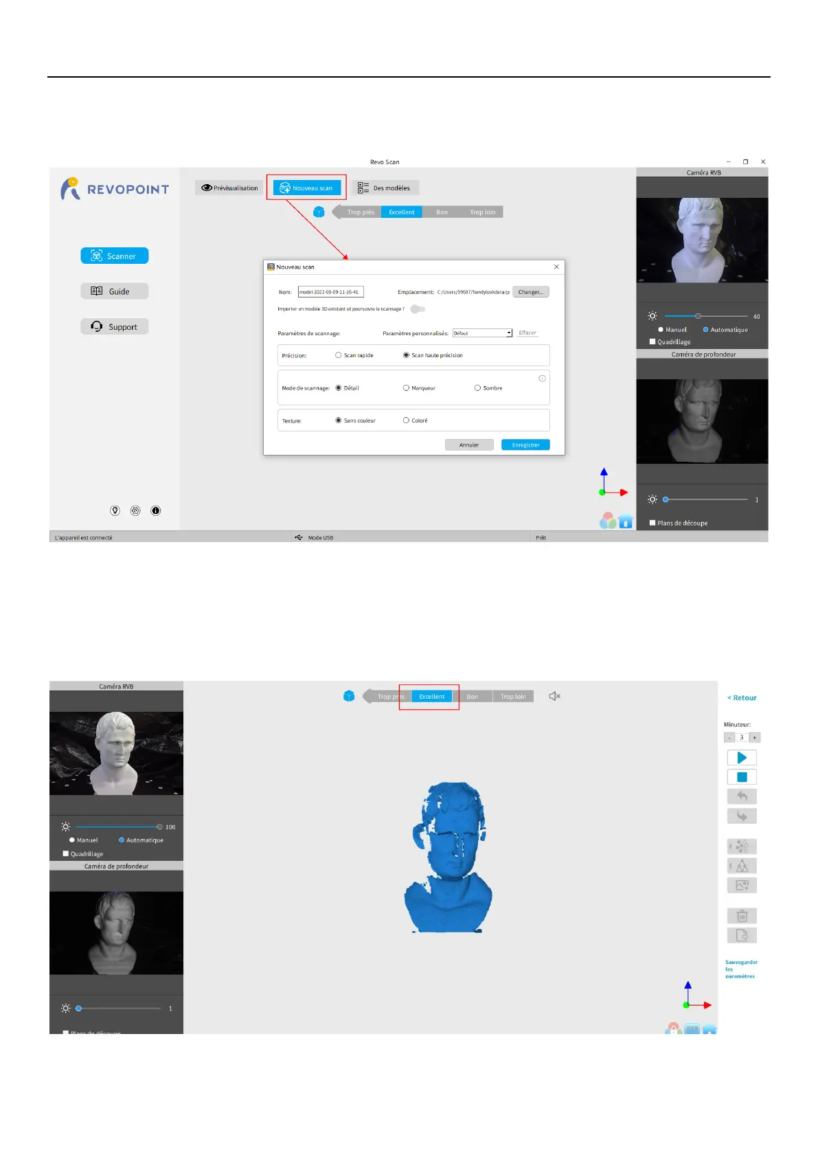 Après avoir spécifié les options Précision, Mode de numérisation et Texture, appuyez sur "OK" pour accéder à la page de