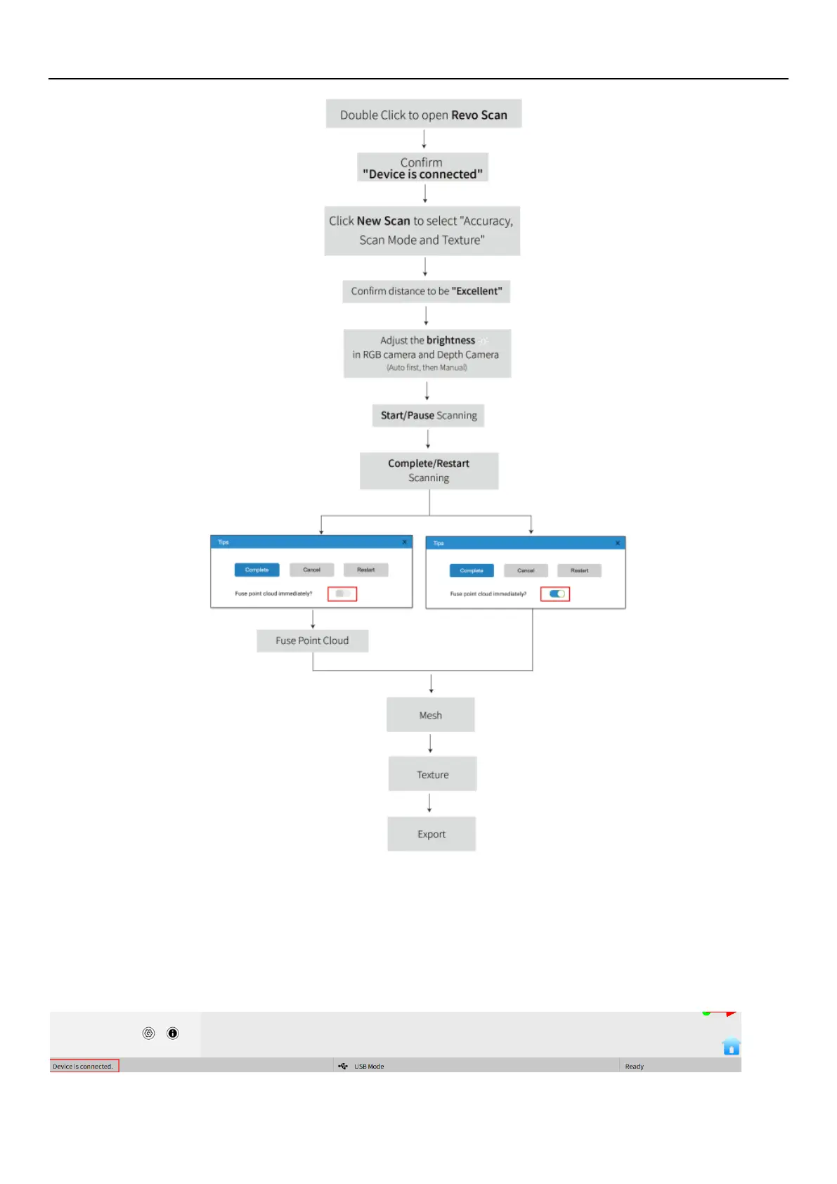 After opening Revo Scan, confirm the device connection status: