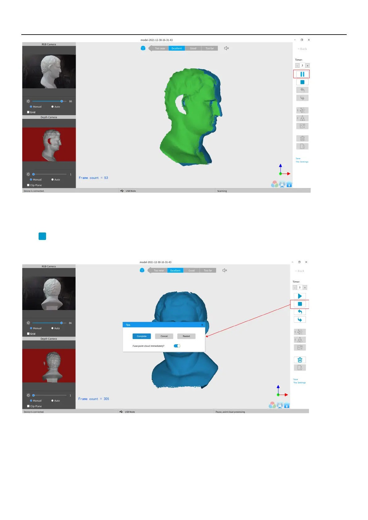 Click and the "Complete" button in the popup to fuse the point cloud data, or press the “Restart” button to delete the