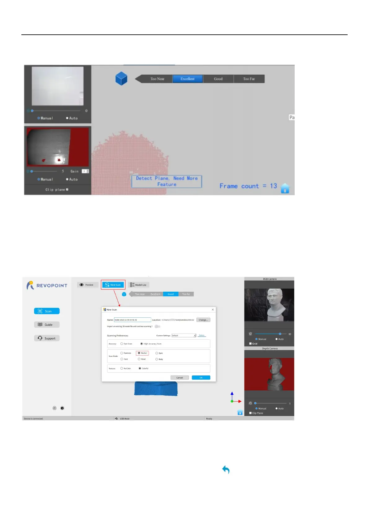 frame’s point cloud to the other frames. If no usable data has been scanned, the best course of action is to Stop scanning,