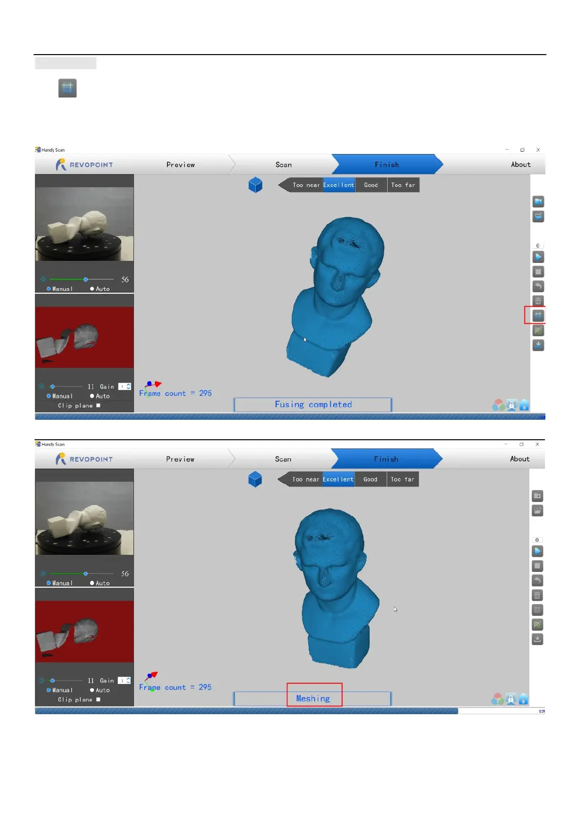 Click to start converting the scanned point cloud data into a mesh. This is an optional step; the Handy Studio app can also mesh the point