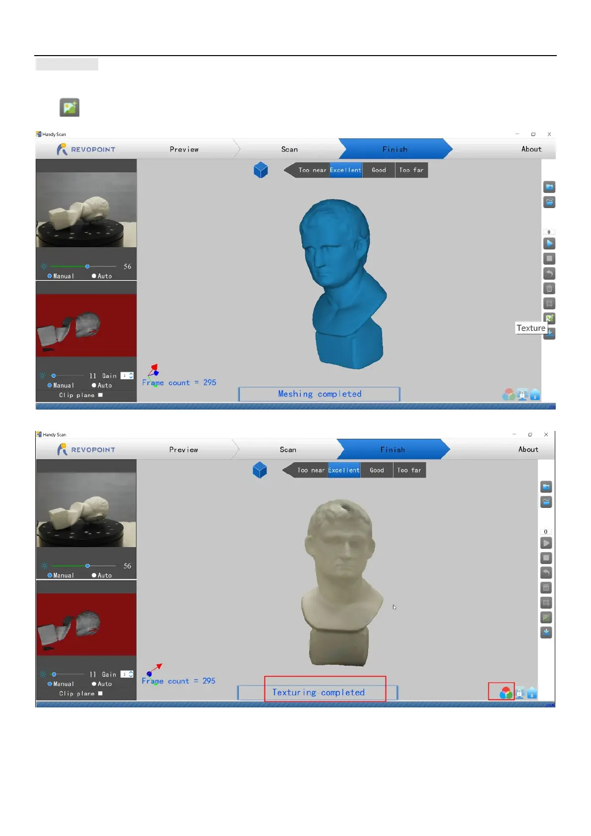 The Texture function only applies to scans made with the "Color" option selected (see section “Start a New Project”).