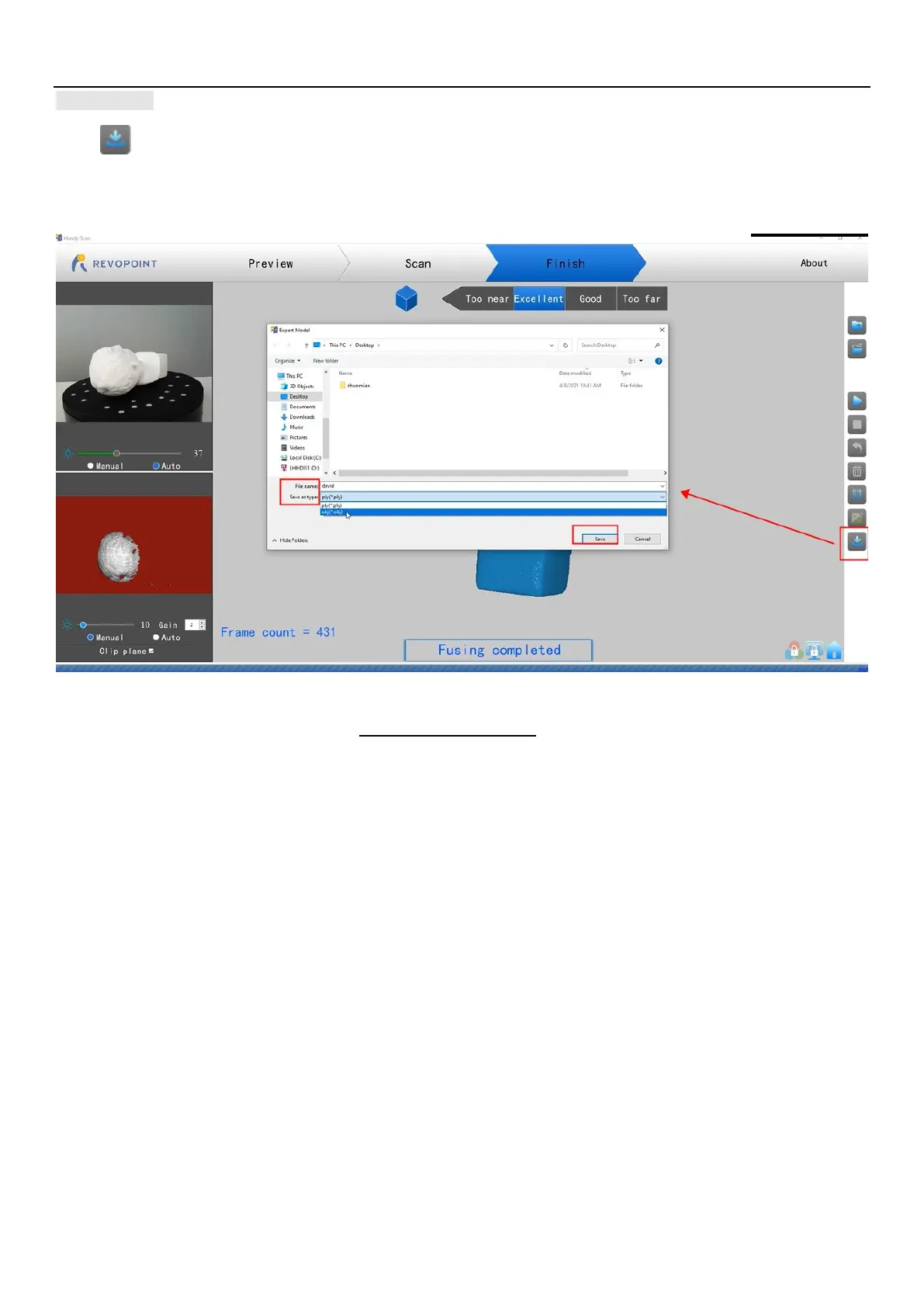 Select a file format (obj., stl., & ply. are supported) and a file name.