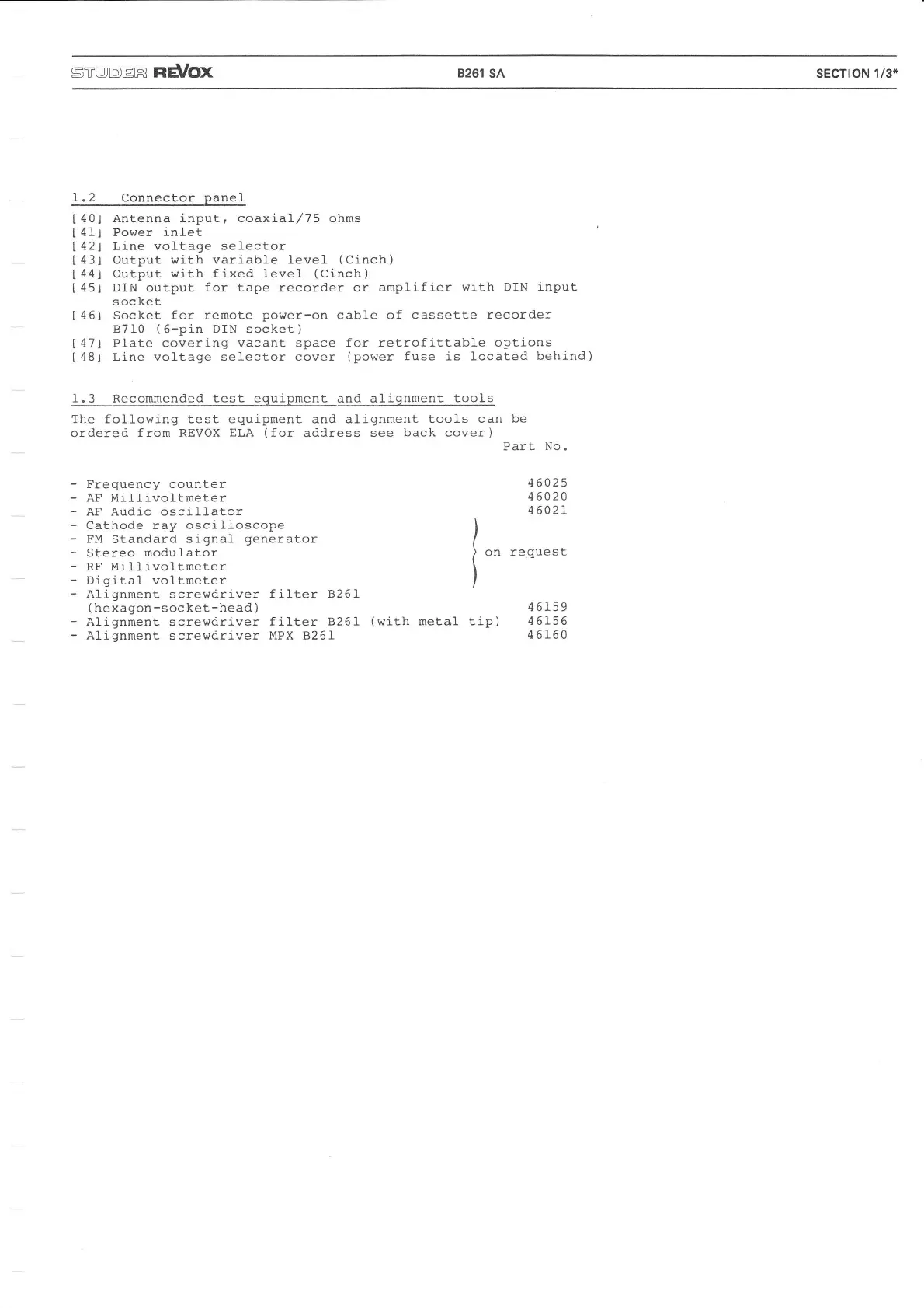 Revox B261 - Connector Panel Description; Recommended Test Equipment