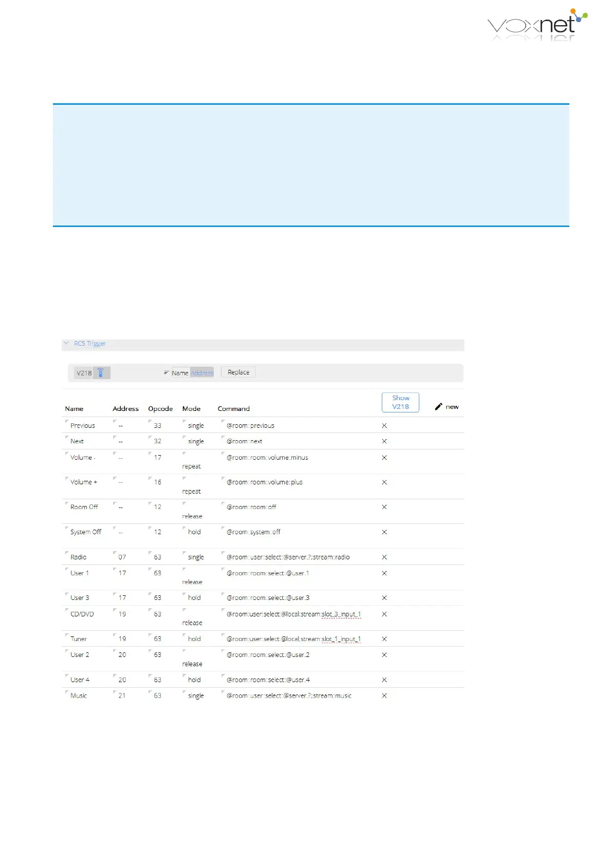 Commands created using Voxnet text are assigned to the RC5 codes [Address + OpCode] in the RC5 trigger setup.