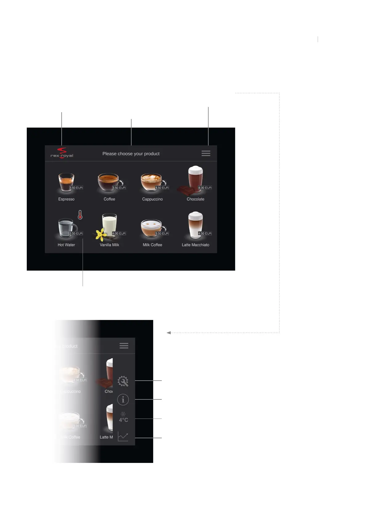 Rex-royal S300 - Self-Service Mode Interface; Self-Service Product Selection; Service Menu Access in Self-Service