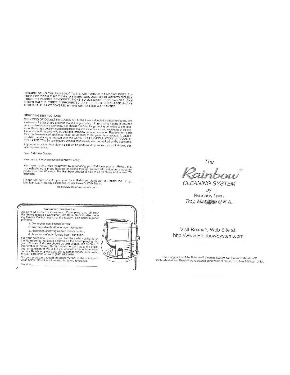 Rexair Rainbow E Series - Servicing Instructions; Consumer Care Number