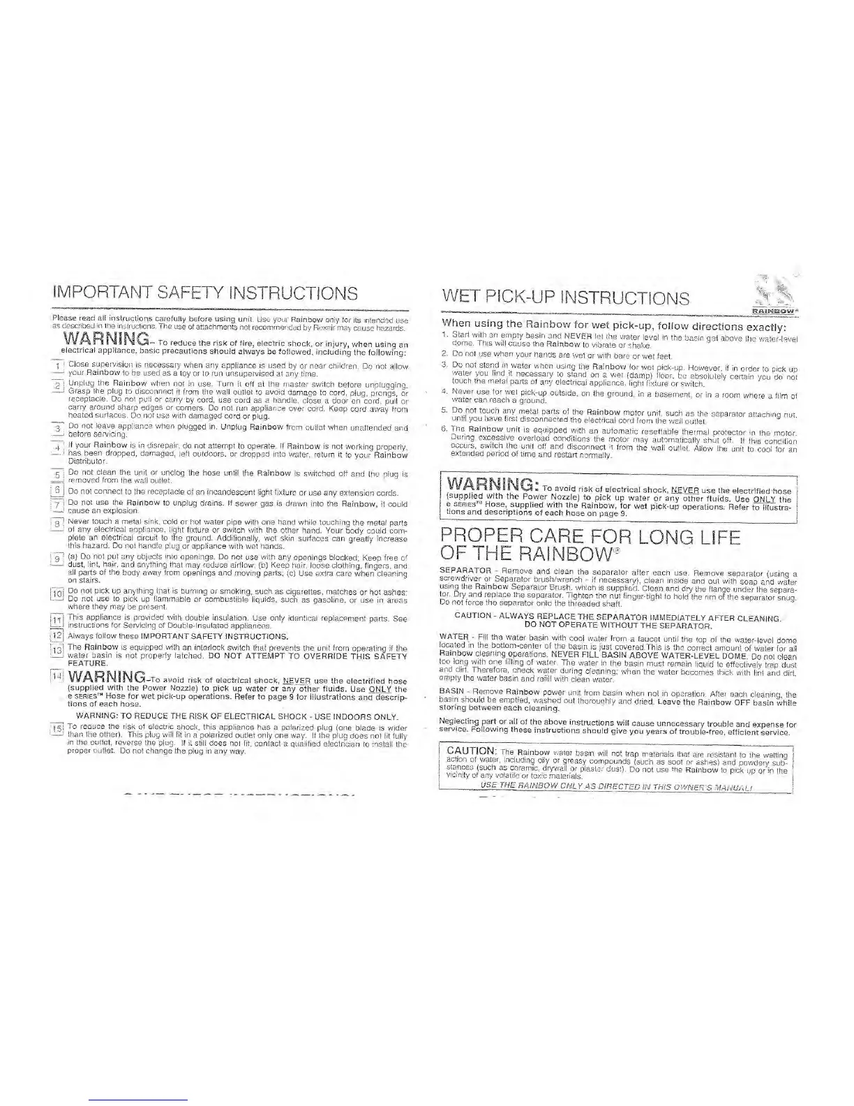 Rexair Rainbow E Series - Important Safety Instructions; Wet Pick-up Instructions; Proper Care for Long Life of the Rainbow