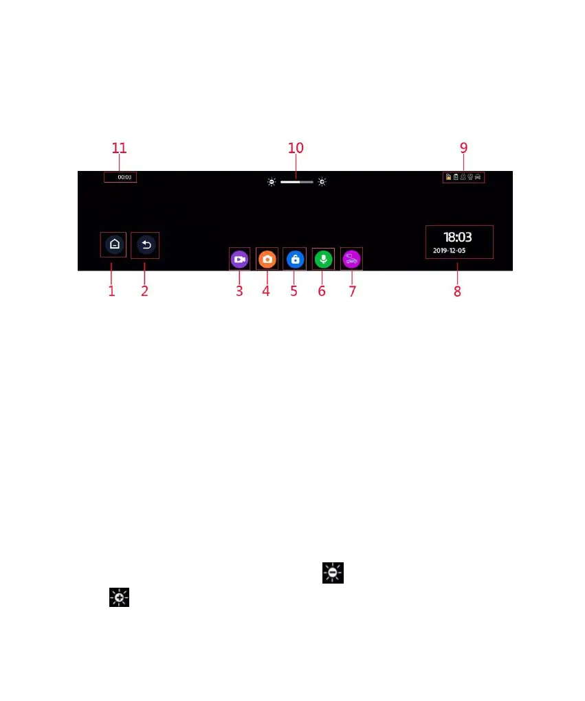 10. Adjustment of screen brightness. Click to decrease brightness and
