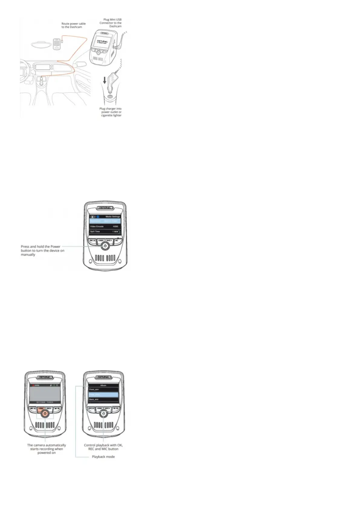 The device is automatically powered on when plugged into a 12V accessory socket or cigarette lighter and received