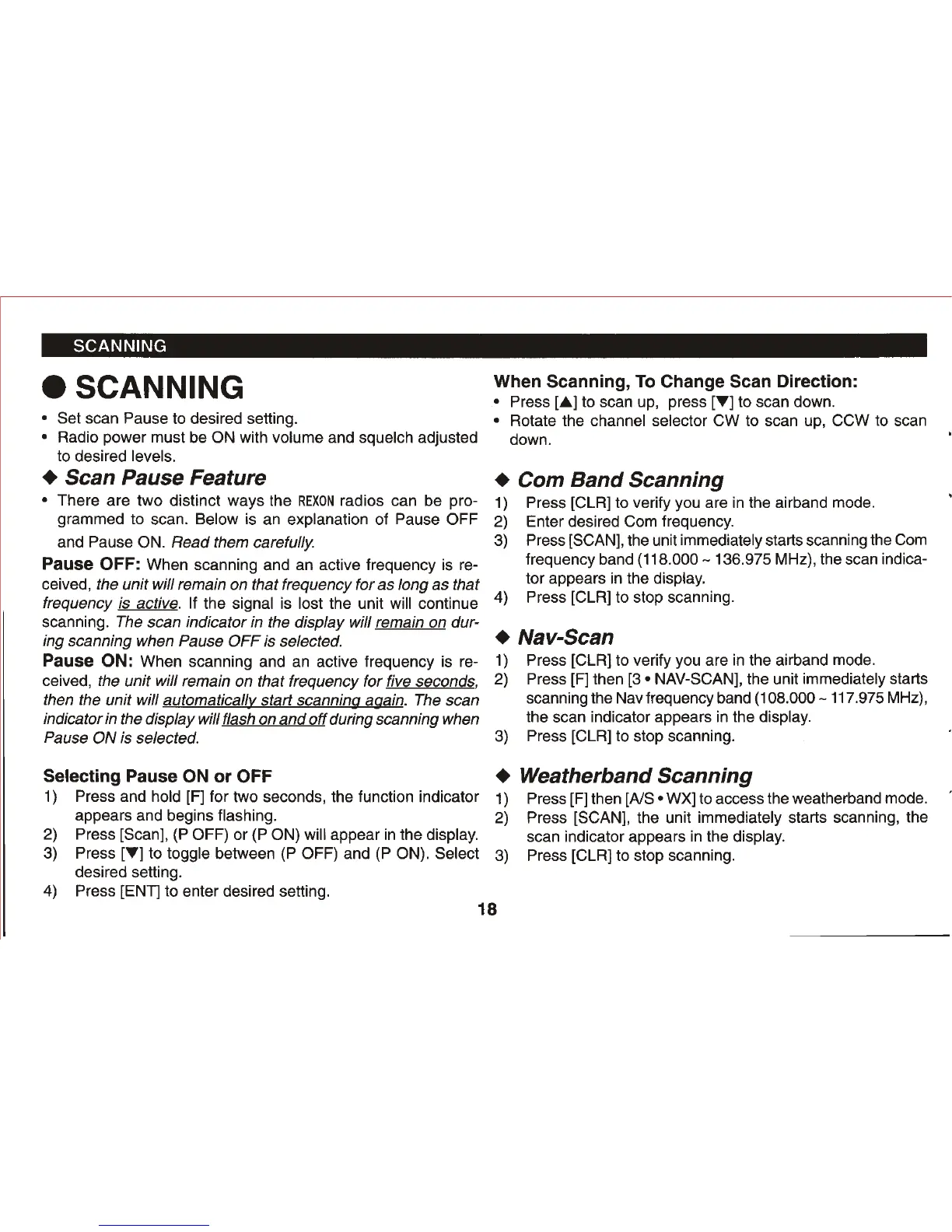 REXON RHP-520 - Scanning; Scan Pause Feature; Com Band Scanning; Nav-Scan
