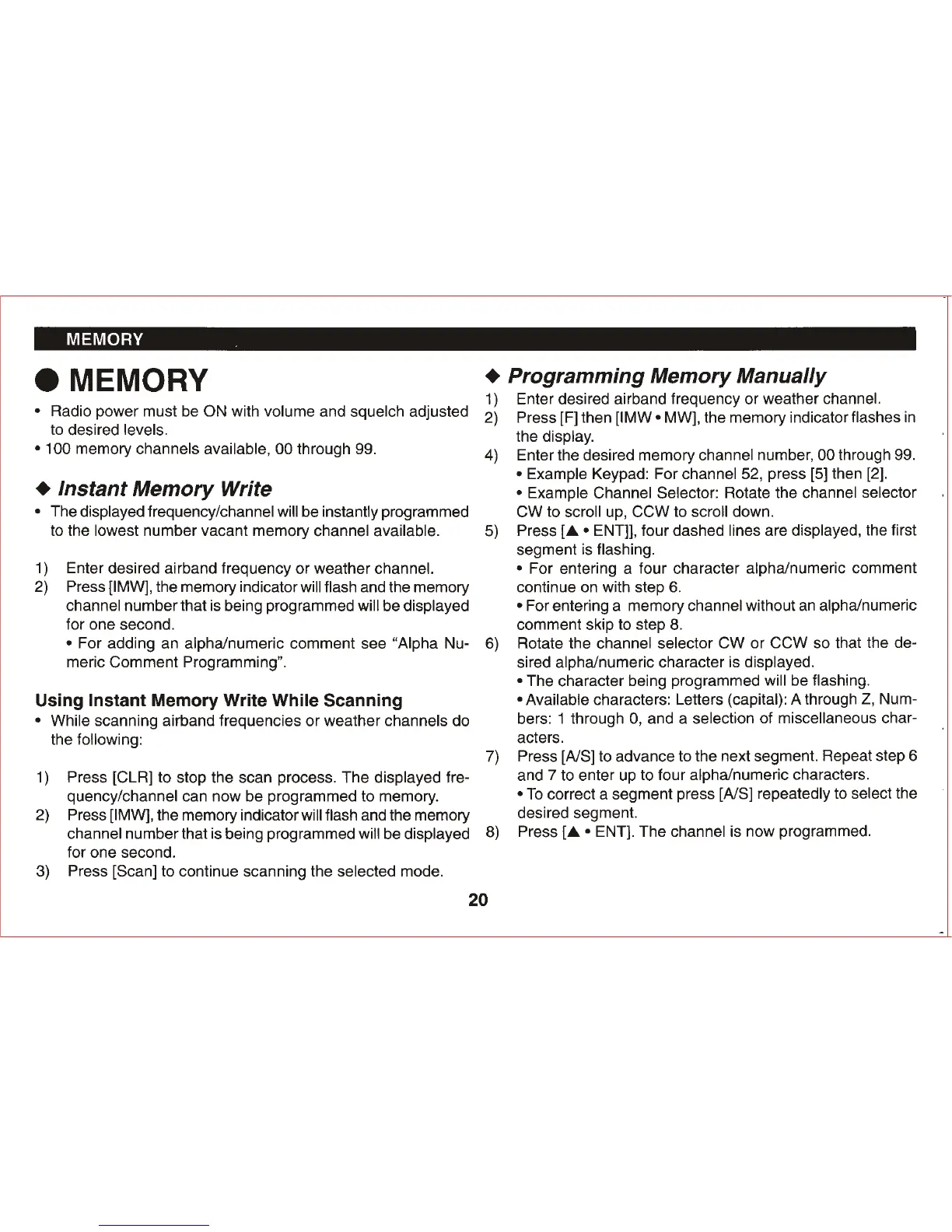 REXON RHP-520 - Memory; Programming Memory Manually; Using Instant Memory Write While Scanning