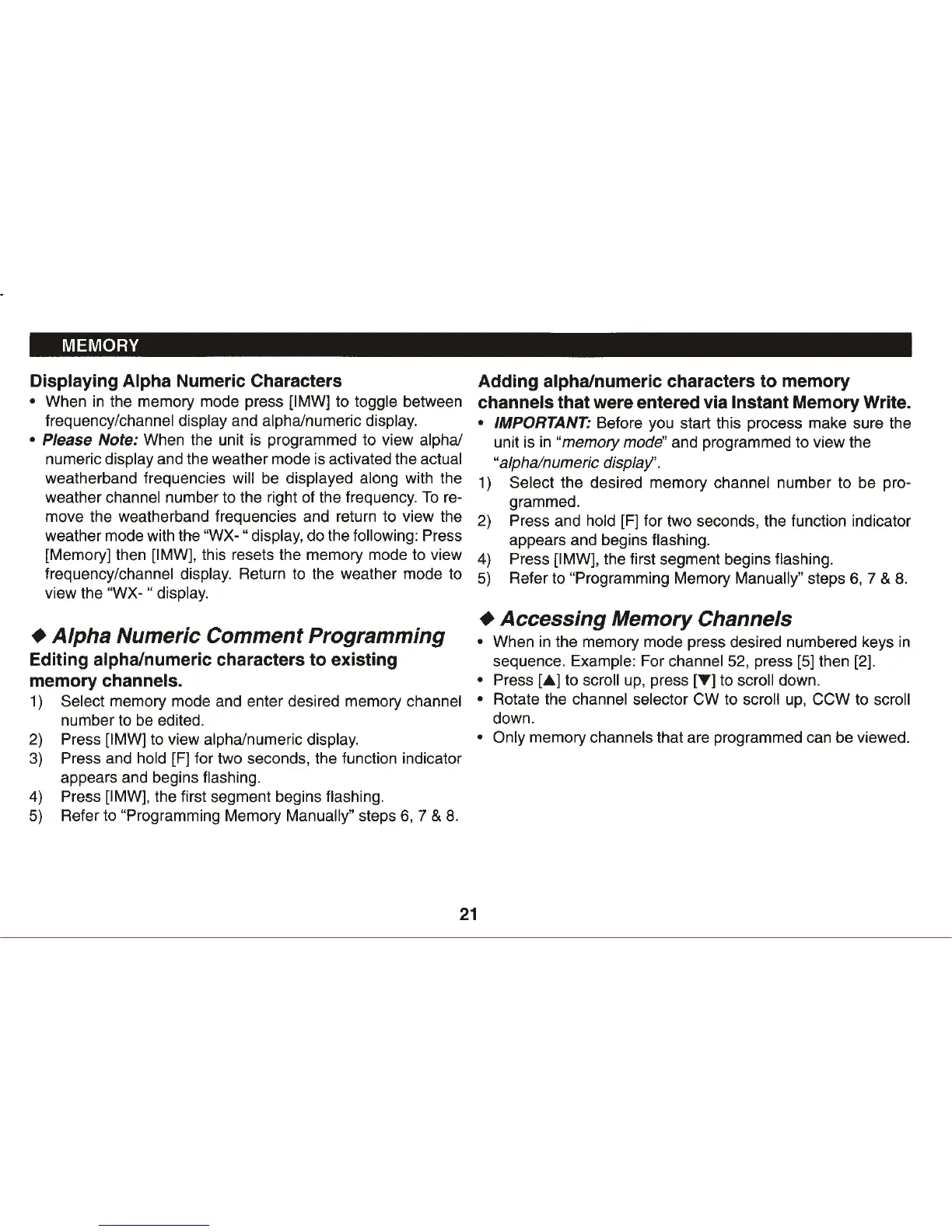 REXON RHP-520 - Alpha Numeric Comment Programming; Accessing Memory Channels; Displaying Alpha Numeric Characters; Adding Alpha;Numeric Characters to Memory Channels