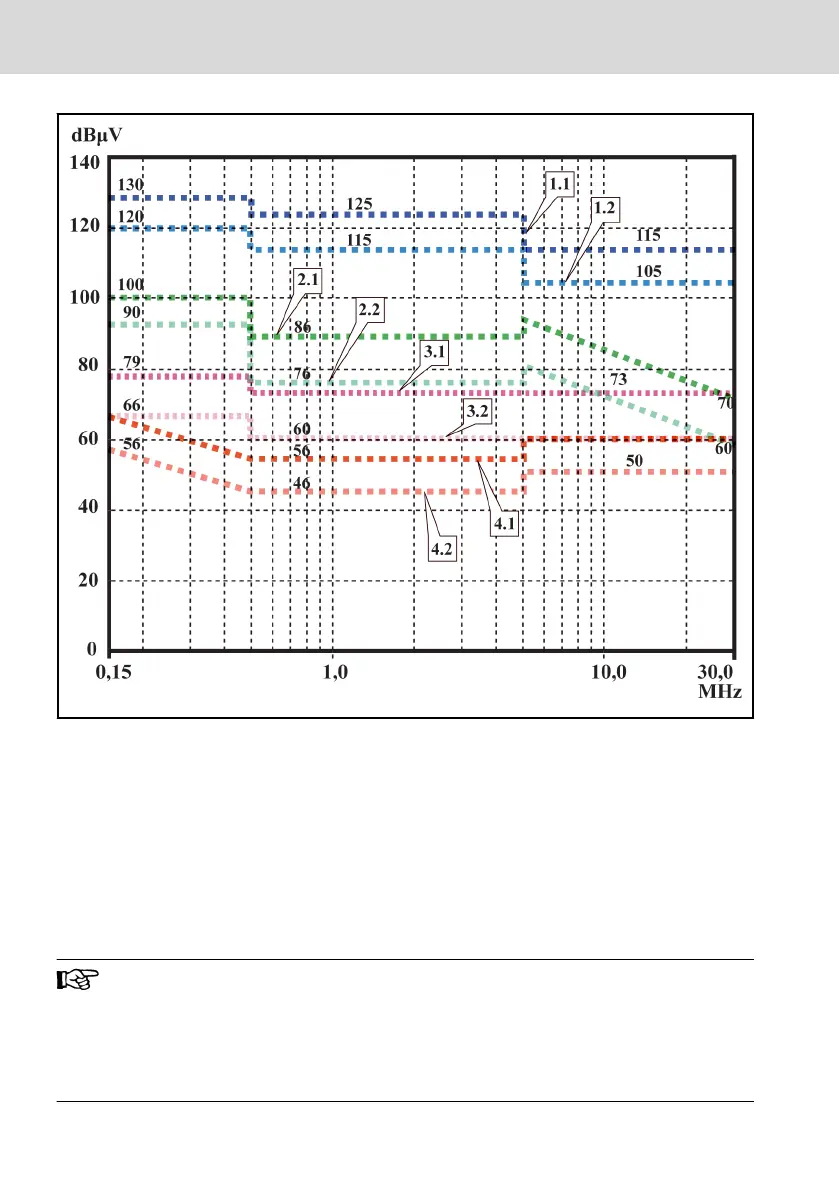 Fig. 11-2: Limit values for line-based disturbances (IEC 61800-3); limit characteristic through
