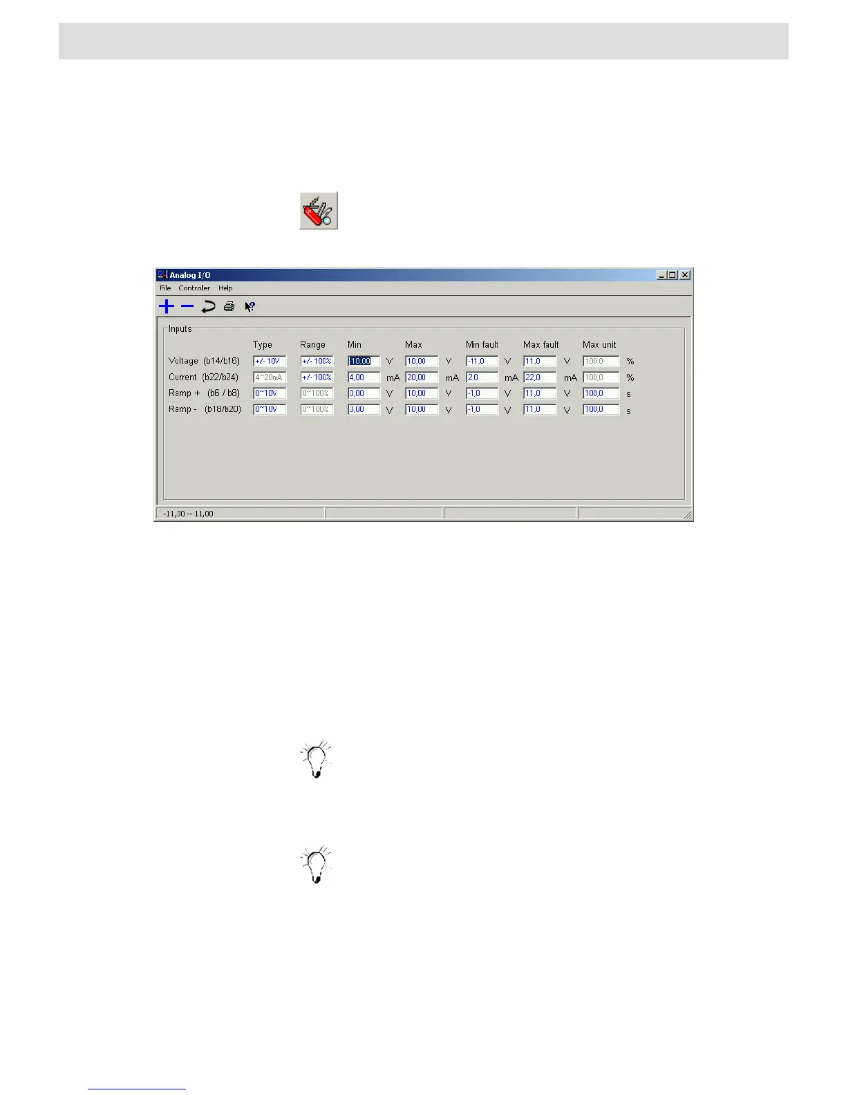 also opens the “Analog I/O” window. A list of existing shortcuts for the