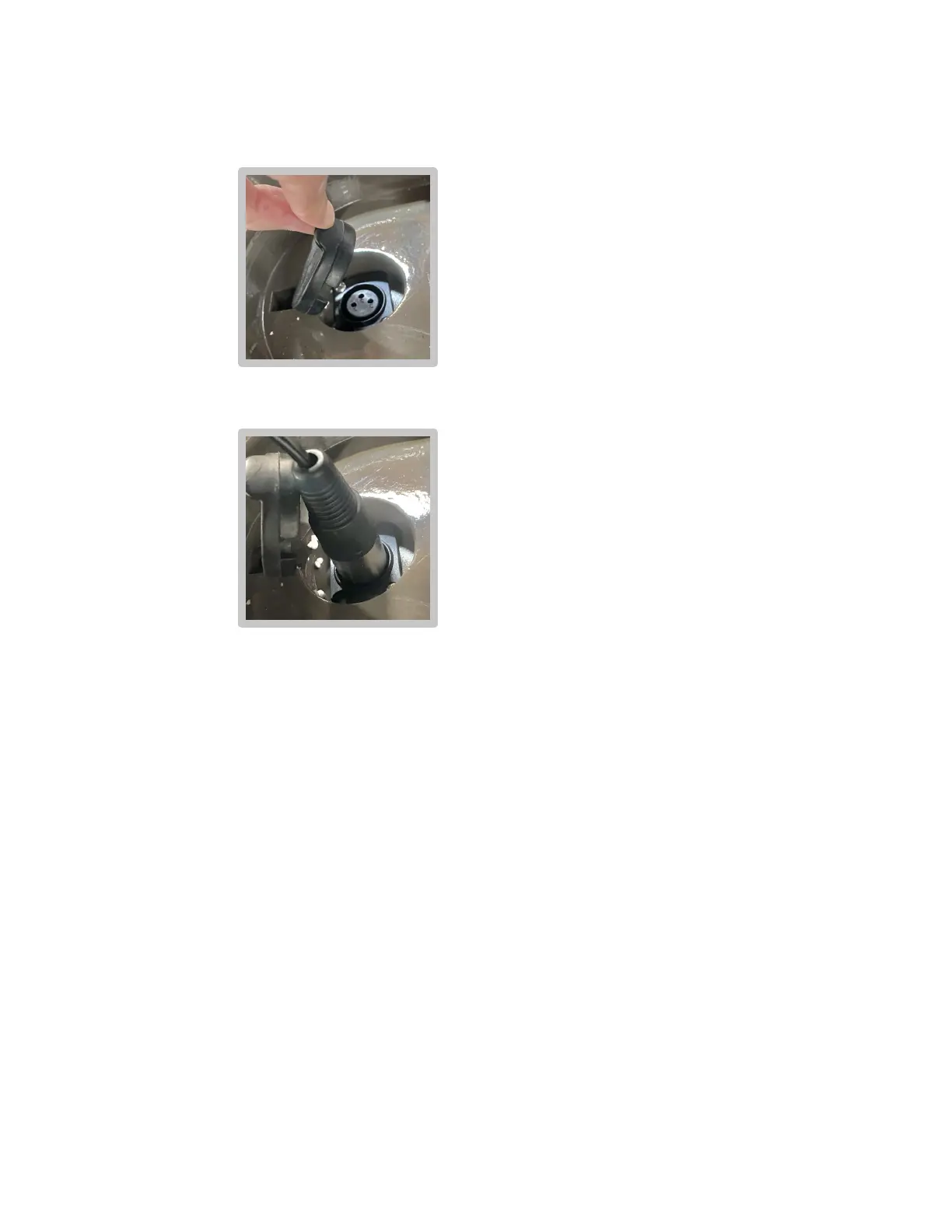 Locate the charging port cover on top of the battery pack.•
