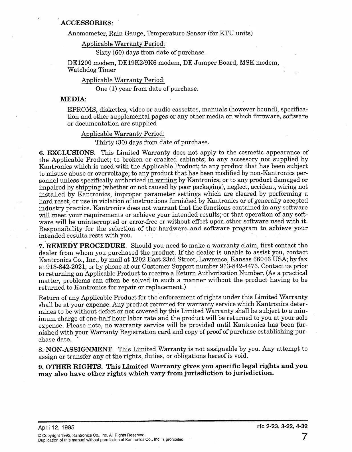 RF Concepts rfc 2-23 - Accessory and Media Warranty; Warranty Exclusions; Warranty Claim Procedure; Non-Assignment of Warranty