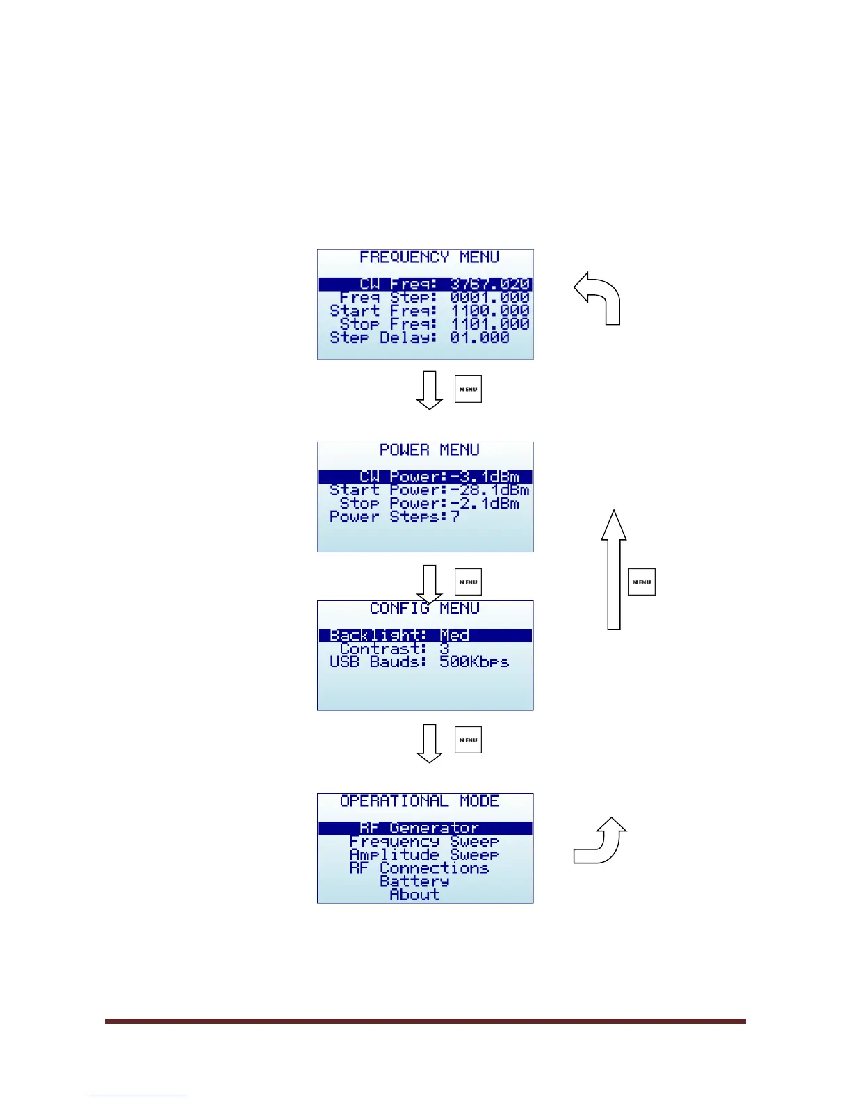 There are several menus in RF Explorer Signal Generator. They are organized on different screens, which you