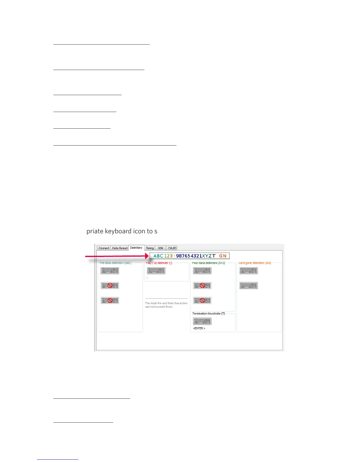 Pre Data Delimiters (ABC): Select from 0 to 3 characters to display at the beginning of the card