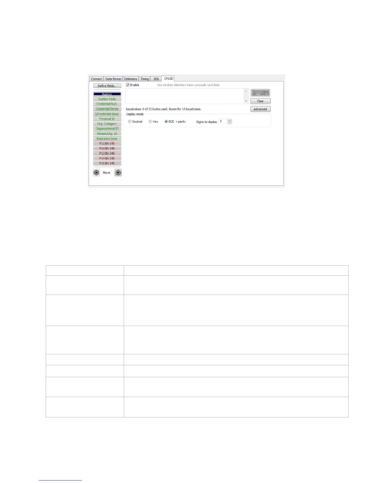 or proximity cards. Use the red buttons to configure additional fields. The fields can be moved to