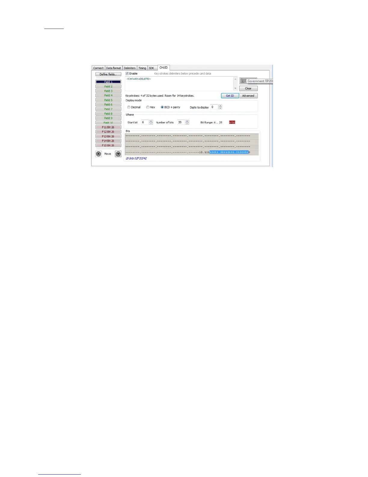 interpretation display of the card data. Click GetID to define the fields to set up the device.