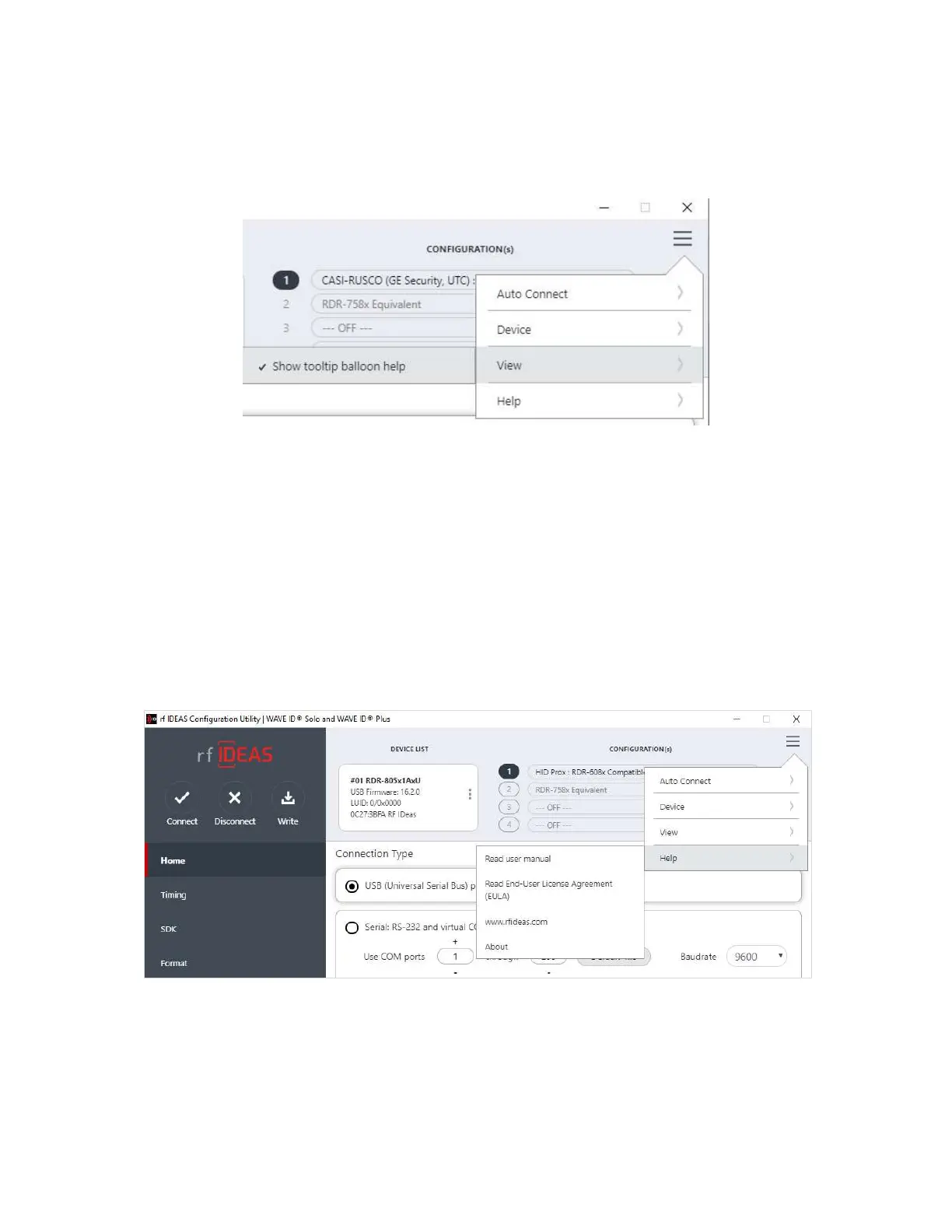 RF IDeas WAVE ID - View Menu; Help Menu
