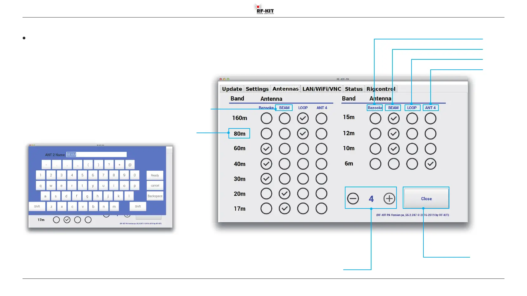 ► Set the number of connected antennas (1-4) by touching „-“ or „+“ in
