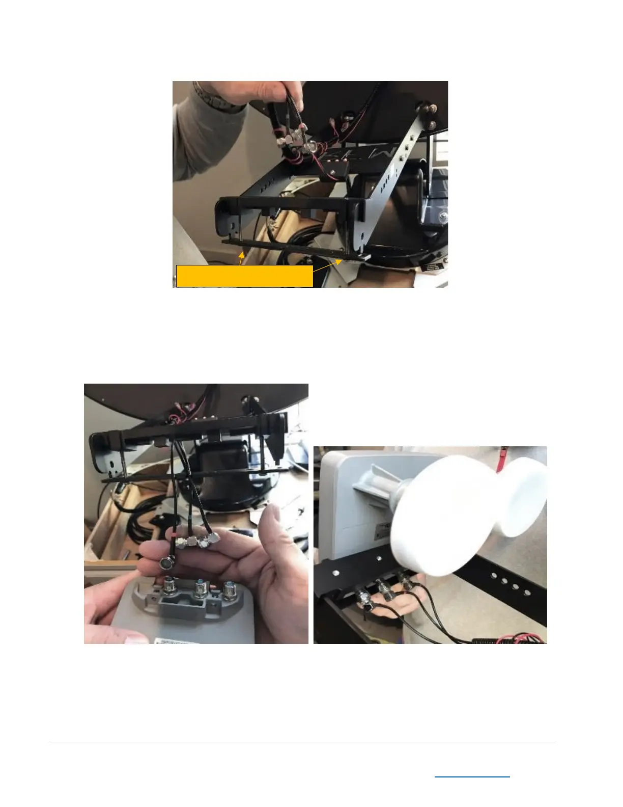 16. Route the LNB cables “through” the LNB brackets and attach to the LNB securely, but do not use