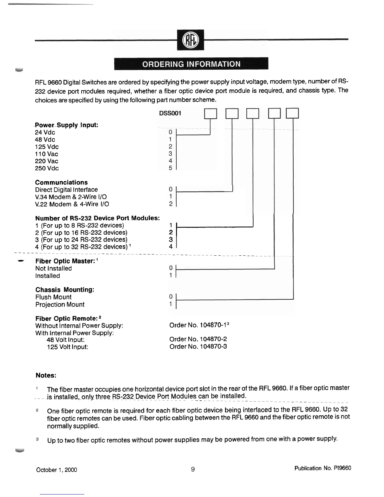 RFL 9660 Digital Switches are ordered by specifying the power supply input voltage, modem type, number of RS-