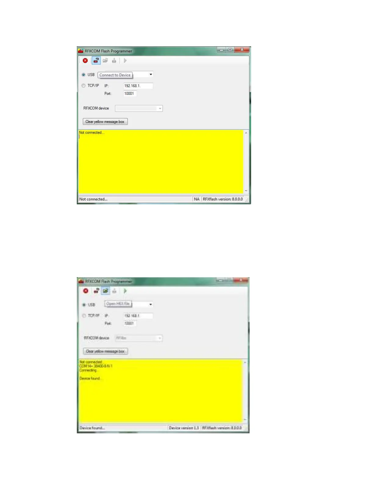 • Click the Open HEX file button and load the RFXtrxyyy??_zz.hex file