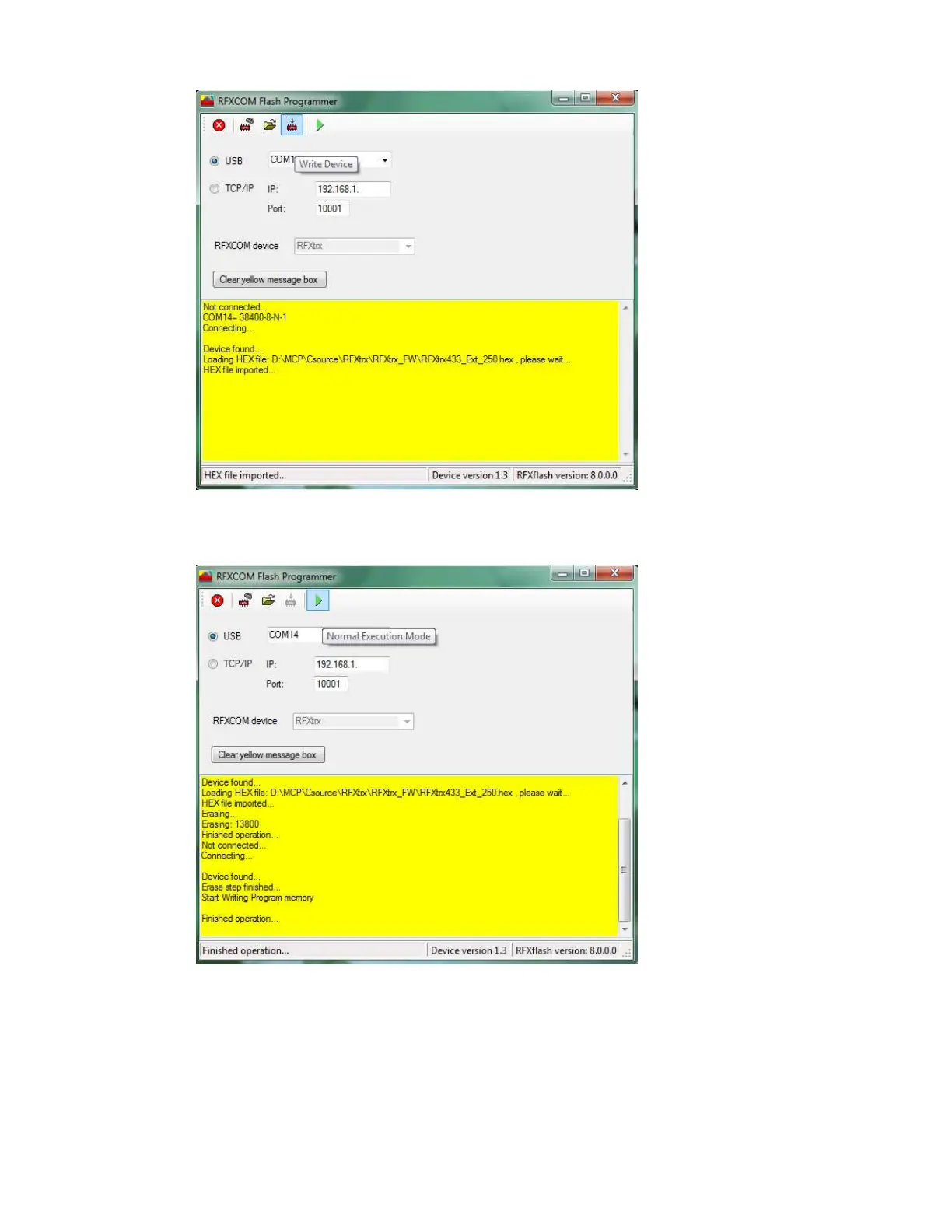 Click on the Normal Execution Mode button to set the RFXtrx to running mode.
