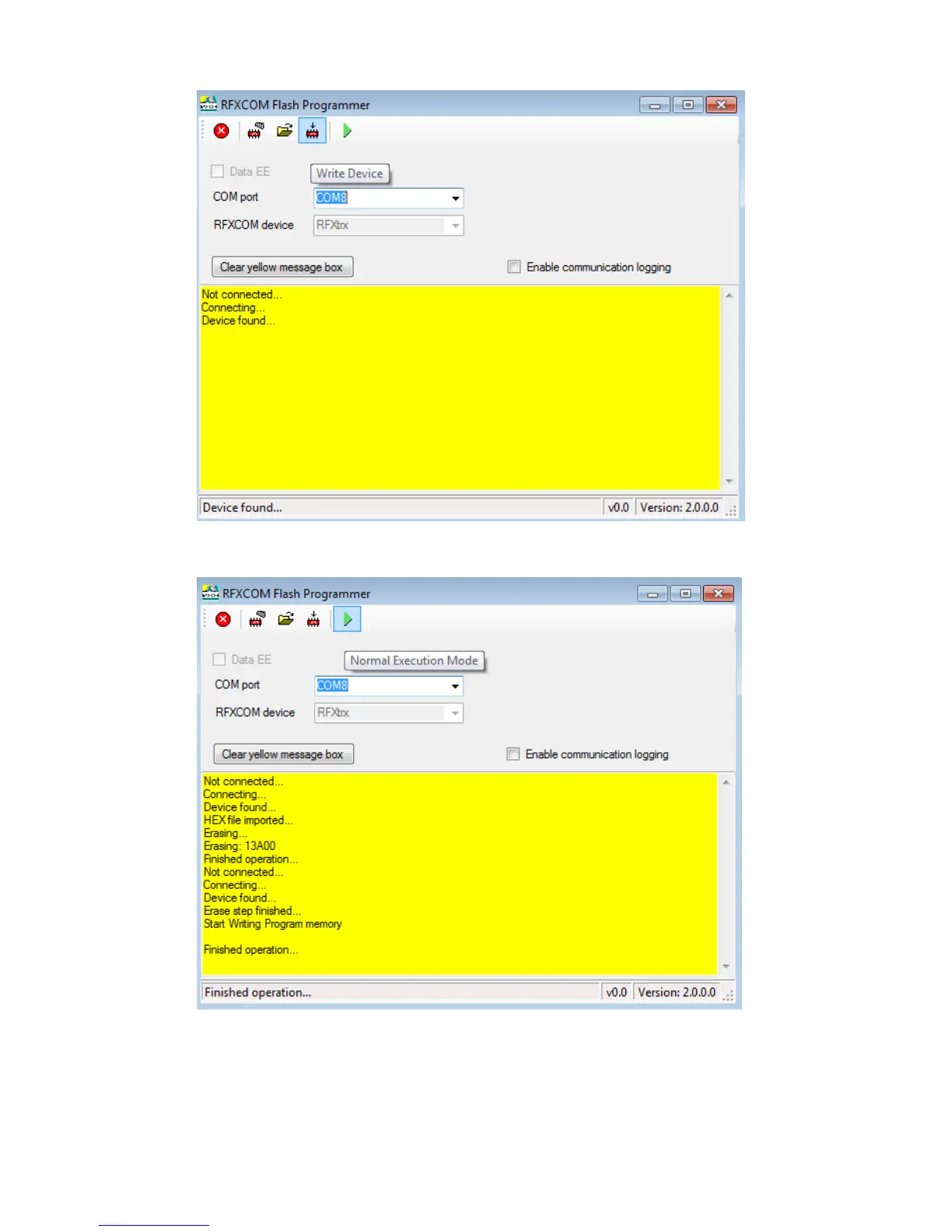 Click on the Normal Execution Mode button to set the RFXtrx433 to running mode.
