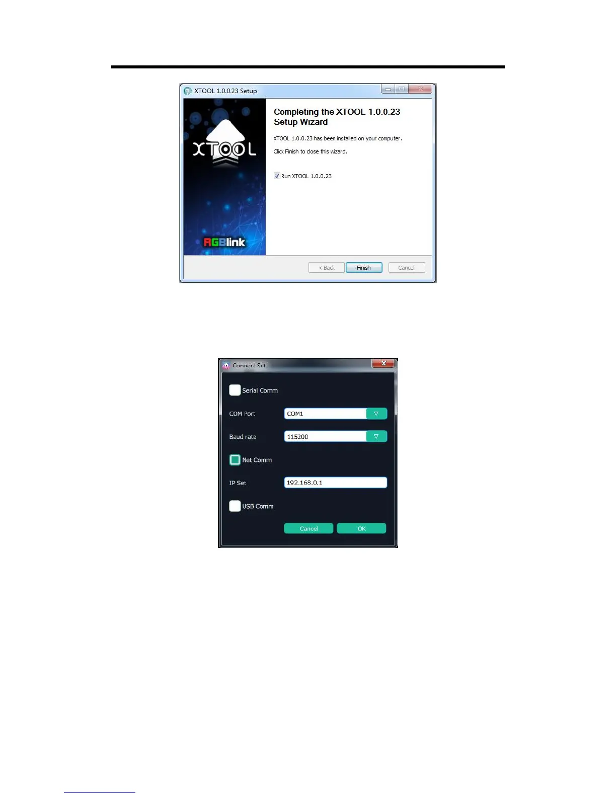 Serial Comm, Net Comm and USB Comm can be selected. Click “OK” to confirm. When connected,
