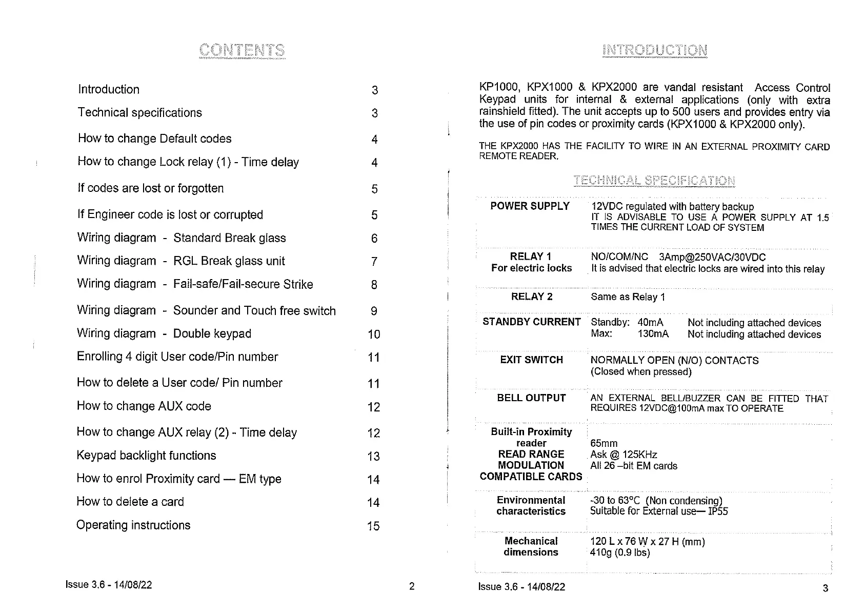 RGL KP1000 - Technical Specification; POWER SUPPLY; RELAY 1 For electric locks; RELAY 2