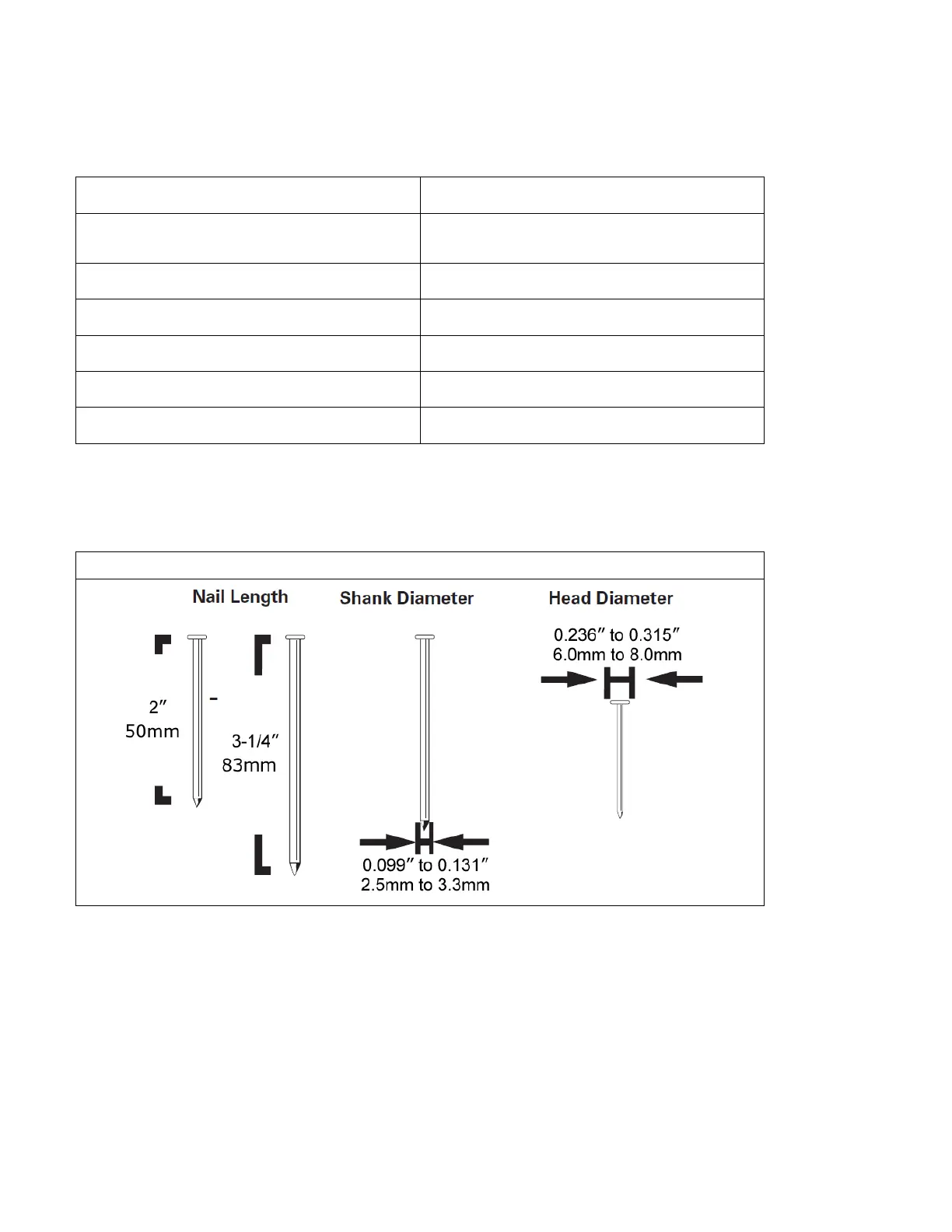 Only the nail sizes shown in the table below can be driven with this nailer.