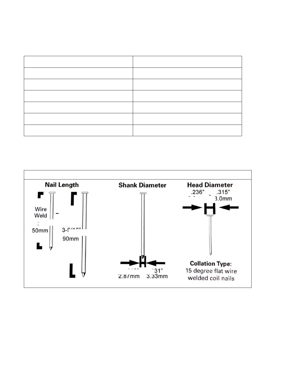 Only the nail sizes shown in the table below can be driven with this nailer.