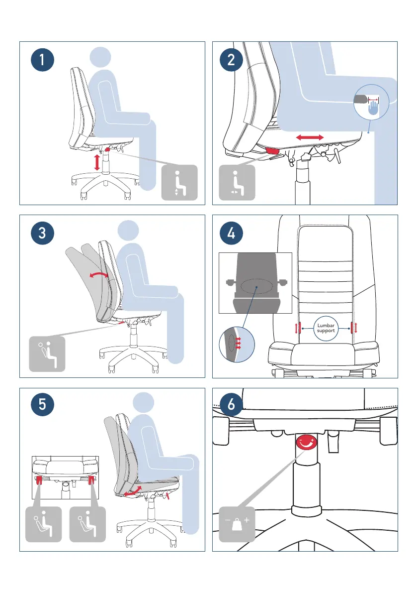 RH Focus - RH Focus Chair Adjustments; Seat and Backrest Adjustments; Ergonomic Support Adjustments; Gas Lift Operation