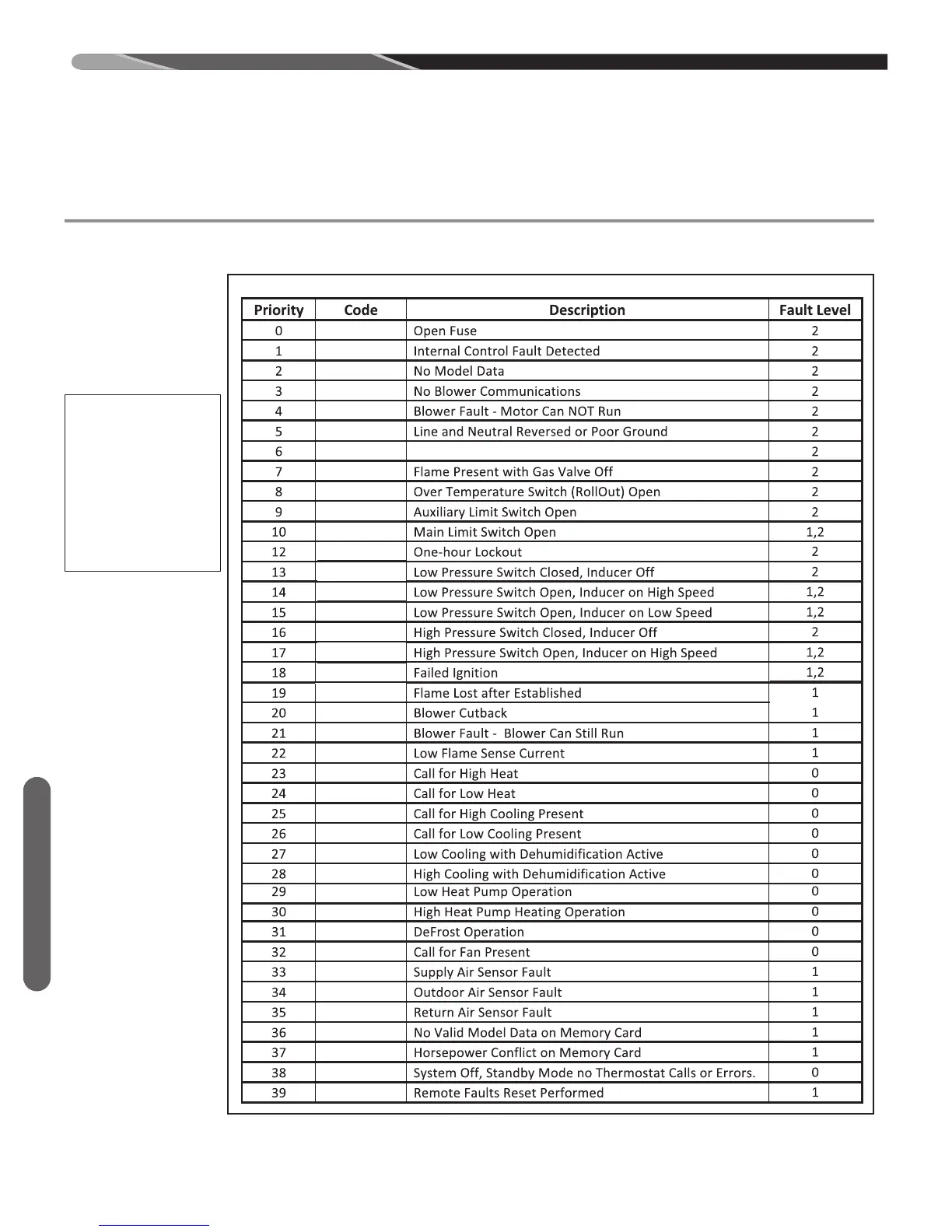 The fault and mode codes and fault priorities are listed below. Priority is to be used to determine which fault to display
