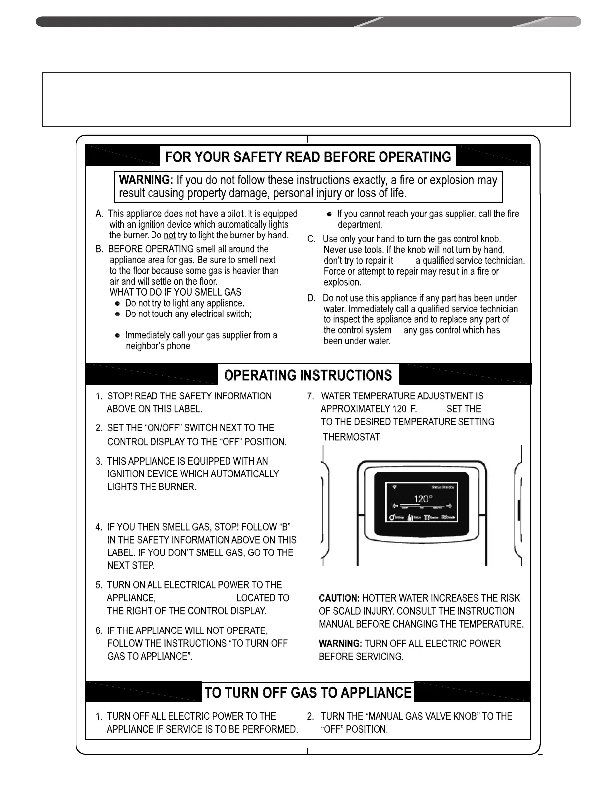 Before operating this water heater, be sure to read and follow the instructions on the label pictured below and all other labels